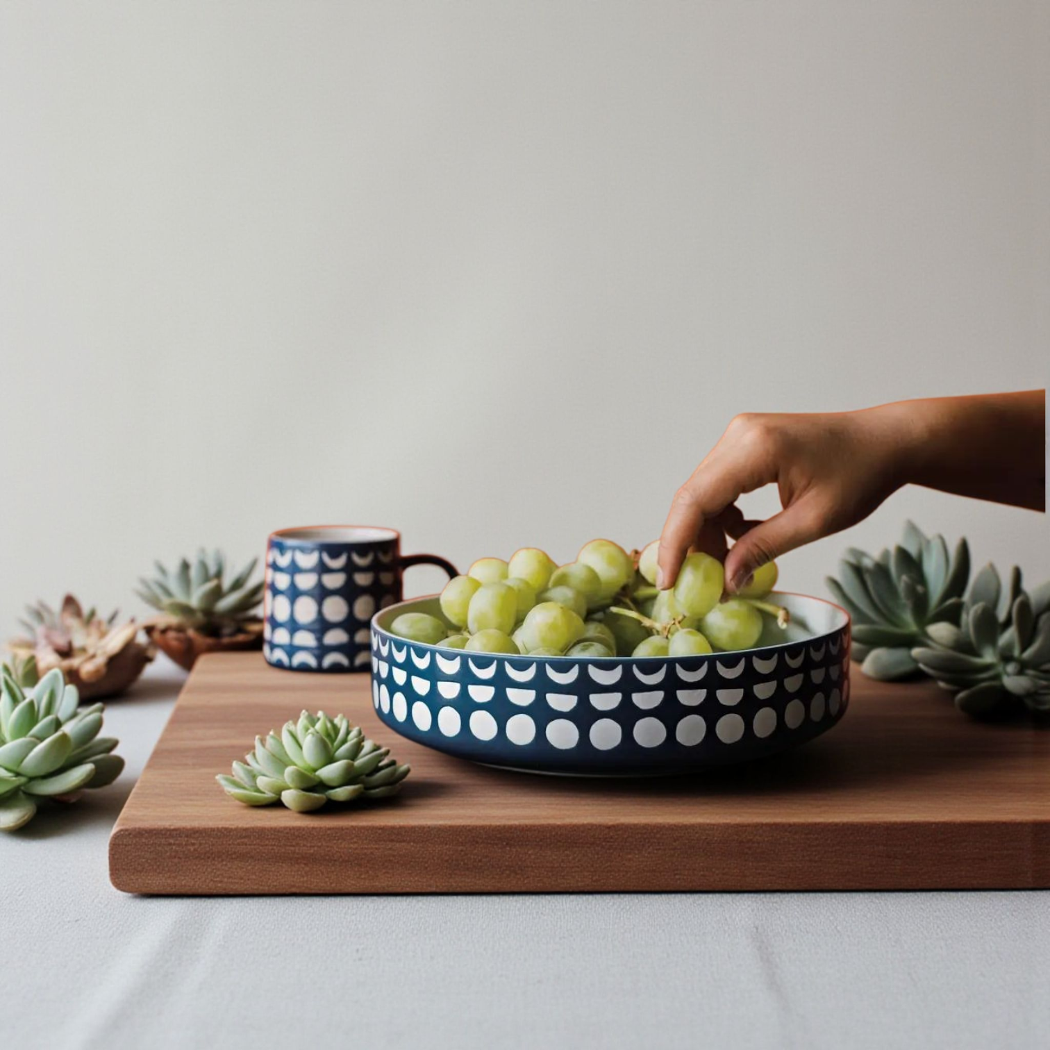 Danica Studio’s signature designs dance around the rim of these low-profile stoneware bowls, bringing a touch of artistry to everyday moments. Whether used for serving, snacking, or simply styling your shelves, these bowls move effortlessly from dinnerware to decor.